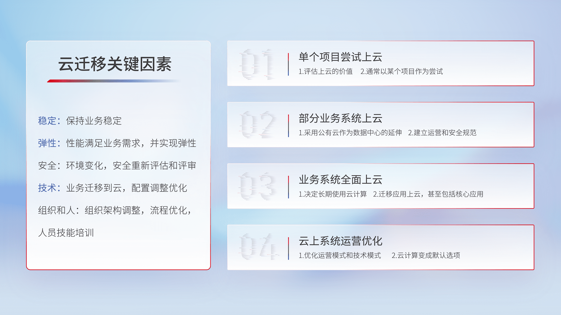 结合实际业务,,,,从规划设计、、、、云平台选型、、、云原生改造、、、数据迁移、、集成交付,,,,迁移全过程为客户识别最佳上云路径,,,,做好风险识别管理,,,,设计网络架构、、身份权限、、、、安全审计合规、、、、操作审计、、、、日志审计、、、、监控告警策略、、、多站点容灾设计等,,,,对云上基础设施进行整体规划,,,,提升IT治理水平,,,以满足弹性、、高可用、、、高性能的需求。。。
