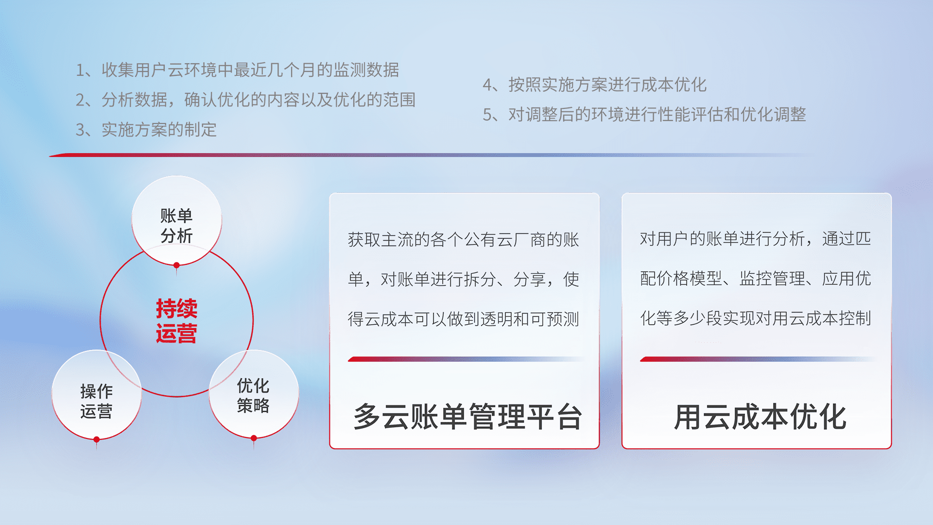 通过多云纳管,,,,以统一的资源数据模型把客户的云资源进行抽象和封装,,进而实现对多云资源的统一操作,,保障云资源管理的可靠性、、、稳定性与可用性。。量身定制化运维内容,,,配置、、、开发运维、、补丁管理、、、、备份、、、监控、、认证和访问管理、、审计和日常巡检等,,,,保障在用云过程中的可靠度,,,稳定度以及高可用率。。。。